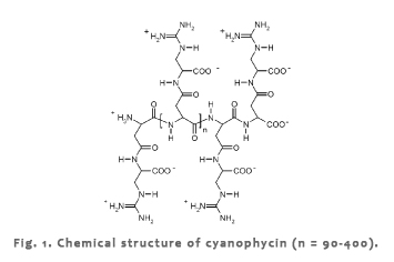 Cyanophycin, also referred to as multi-L-arginyl-poly-[aspartic acid], represents a non-ribosomally synthesized polyamide usually consisting of a poly(aspartic acid) backbone with arginine residues linked to the β-carboxyl group of each aspartic acid moiety by the α-amino group (Fig.1). |