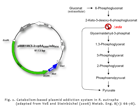 For cyanophycin synthesis only one enzyme is required, which is referred to as cyanophycin synthetase (CphA). Applications for several degradation products of cyanophycin are of special industrial and medical interest. For example, the polymer can function as an environment-friendly substitute for non-biodegradable poly(acrylic acid) or it could be a source of Asp-Arg or Asp-Lys dipeptides, which are used in pharmaceutical products. Especially for the synthesis of new dipeptides production of new cyanophycins consisting of aspartic acid with citrulline, lysine or ornithine, respectively, as side chain instead of arginine is interesting. In addition to Asp-Arg, dipeptides consisting of Asp-Lys, Asp-Cit, or Asp-Orn would broaden the application range of these compounds. To obtain different variants of cyanophycin concerning its composition, the metabolism of R. eutropha will be engineered applying metabolism-based plasmid addiction systems. These systems have been recently approved in R. eutropha and E. coli and provide a tool for stable maintenance of plasmids without using external selection pressure like antibiotics and increased cyanophycin production by recombinant expression of appropriate cyanophycin synthetases. |
