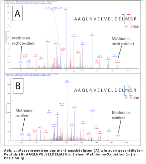 Das Ziel dieses Teilprojekts ist zum einen, die Art und das Ausmaà der oxidativen Proteinmodifikationen in Corynebacterium glutamicum zu charakterisieren, die unter den gewählten, biotechnologisch relevanten Wachstumsbedingungen von Bedeutung sind. Dabei werden sowohl SDS-Gel basierte, wie z.B. der OxyblotTM zur Detektion von carbonylierten Proteinen, als auch Gel-freie Shotgun-Proteomik-Methoden eingesetzt. Mittels Massenspektrometrie kann anschlieÃend die (Teil-) Sequenz des Peptids (MS2-Spektrum, s. Abb. 2A und B) und damit die geschädigte Aminosäure identifiziert werden. Zum anderen wird weitergehend mittels Massenspektrometrie der Anteil der Modifizierung in Abhängigkeit von der Wachstumsbedingung quantifiziert. Auf Grundlage dieser Informationen soll die Aminosäuresequenz des geschädigten, nicht-funktionalen Proteins insoweit geändert werden, dass das Enzym in einem Produktionsstamm resistenter gegenüber oxidativem Stress ist. |