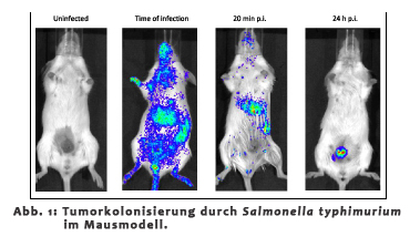 Die HZI-Gruppe konzentriert sich in erster Linie auf die Untersuchung der Interaktion zwischen E. coli, dem Tumorgewebe und der Immunantwort des Wirts in vivo. Dabei steht die Austestung der im TUD-Teilprojekt neu entwickelten E. coli-Mutanten hinsichtlich ihrer in vivo Tauglichkeit mittels muriner Tumormodelle (Abb. 1) im Vordergrund. |