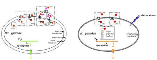 Das Gram-positive Bakterium Bacillus pumilus und das Gram-negative Bakterium Burkholderia glumae sind industriell relevante Mikroorganismen, die bereits von den groÃen Chemieunternehmen Henkel AG & Co. KGaA und BASF AG als Produktionsstämme evaluiert bzw. verwendet werden. Im Rahmen dieses Projekts werden diese beiden Stämme verwendet, um industriell relevante Enzyme wie Lipasen, Phytasen oder Laccasen möglichst effizient zu produzieren und zu sekretieren [1-3]. Zudem sollen biotechnologisch interessante Sekundärmetabolite wie Lipopeptide und Rhamnolipide, die sich als Biodetergentien eignen, produziert werden. Hierzu wird der physiologische Zustand der genannten Bakterien unter Produktionsbedingungen zunächst mi Hilfe globaler Analysemethoden wie Transkriptomics, Proteomics, und Metabolomics analysiert. AuÃerdem wird das Genom eines Bu. glumae Produktionsstammes sequenziert und mit dem Genom des entsprechenden Wildtyp-Stammes verglichen. Die Resultate aus diesen Analysen werden verwendet, um Gene und Proteine zu identifizieren, deren Manipulation mit molekularbiologischen Methoden zur Konstruktion von neuen Produktionsstämmen mit verbesserten Eigenschaften führen. |