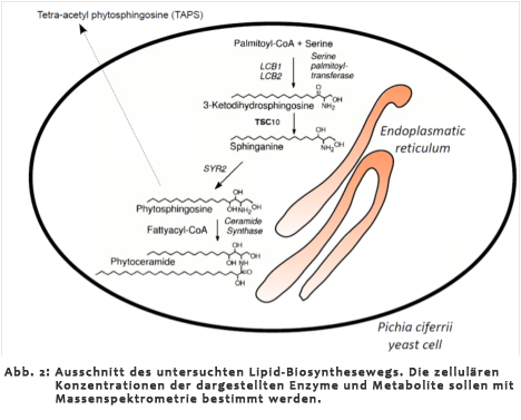 Modelle metabolischer Netzwerke sind ein wichtiges Werkzeug rationaler Stammentwicklung. Entscheidend für die Leistungsfähigkeit eines Modells ist die Qualität der zugrundeliegenden Daten. Insbesondere bei kinetischen Modellen ist die Gewinnung der benötigten Daten schwierig und/oder zeitaufwendig. Hauptanliegen des Projektes ist es daher, moderne Verfahren der Massenspektrometrie einzusetzen und weiter zu entwickeln, um den Schritt der Datenerzeugung entscheidend zu verbessern und zu beschleunigen. Als biotechnologische Fragestellung wird die Lipidproduktion mit Hefen zusammen mit dem Industriepartner Evonik Degussa GmbH bearbeitet. So ist die Hefe Pichia ciferrii (Abb. 1) von Natur aus in der Lage, groÃe Mengen von Phytosphingosin zu synthetisieren, welches z.B. für Kosmetika verwendet wird. |