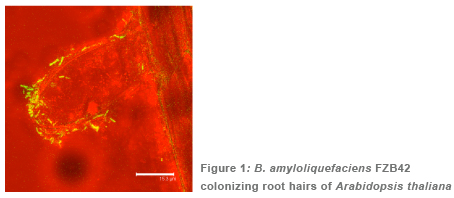 Die Expression der Gene, die die Fähigkeit von B. amyloliquefaciens zur Kolonisierung der Rhizosphäre determinieren, wird auf Transkriptions- (RNA-Microarray) und Translationsebene (Proteomics) untersucht. Die antagonistische Wechselwirkung zwischen phytopathogenem Pilz und Bacillus und vice versa ist dabei von besonderem Interesse. Besonderes Augenmerk wird auf den direkten Nachweis der Bildung von Sekundärmetaboliten durch B. amyloliquefaciens im Bereich der pflanzlichen Wurzelzone gelegt. Grundlage für die Entwicklung eines effizienten Biokontrollpräparates auf der Basis von FZB42 ist die Beantwortung der Frage, ob die Biokontrollwirkung von FZB42 überwiegend auf (i) der Produktion antifungaler Sekundärmetaboliten, (ii) auf einer direkten Wachstumskompetition während Kolonisierung der Pflanzenwurzeln, oder (iii) auf eine Verstärkung der induzierten, systemischen Resistenz der Pflanze gegenüber pathogenen Mikroorganismen zurückgeht. |